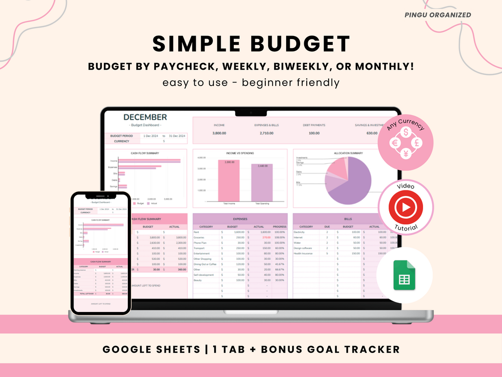 Take control of your finances with this all-in-one Google Sheets Simple Budget Template! Whether you budget weekly, biweekly, monthly, or by paycheck this easy-to-use budget planner helps you track income, expenses, bills, debts, savings, and financial goals.