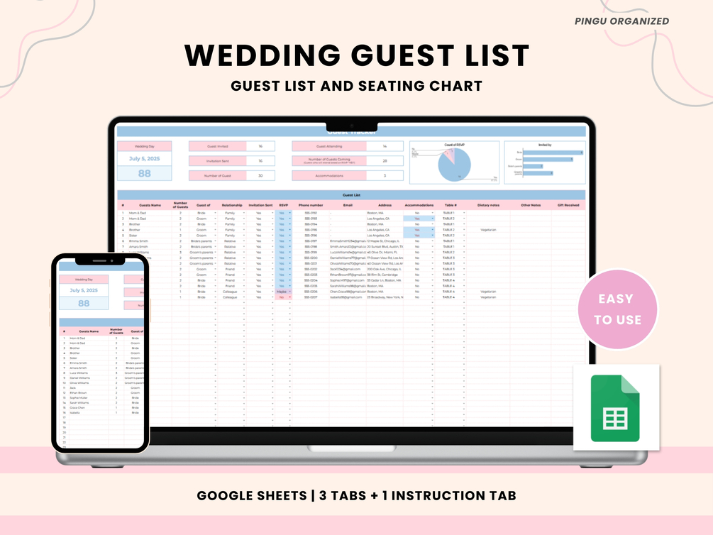 Plan your big day with ease using our Wedding Guest List and Seating Chart Template for Google Sheets! This all-in-one spreadsheet is your ultimate wedding planning companion to keep track of guest names, RSVPs, meal choices, table assignments, and more—all in one organized, editable sheet.